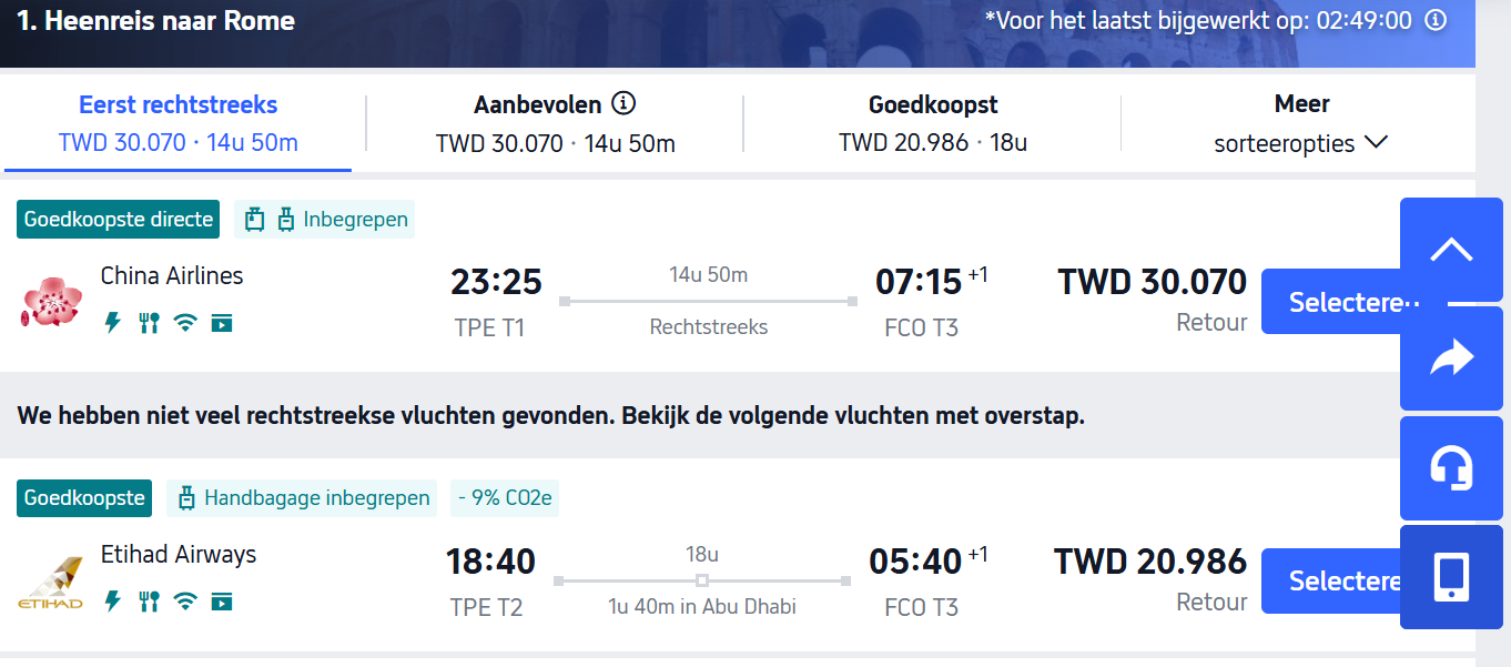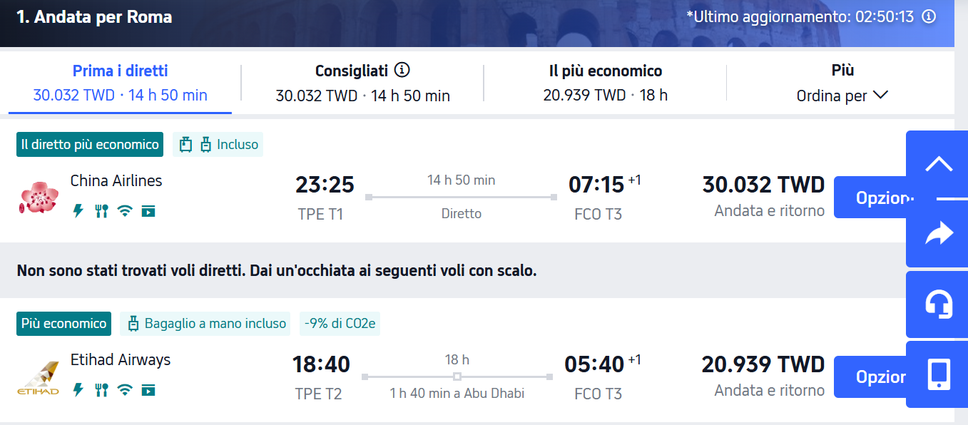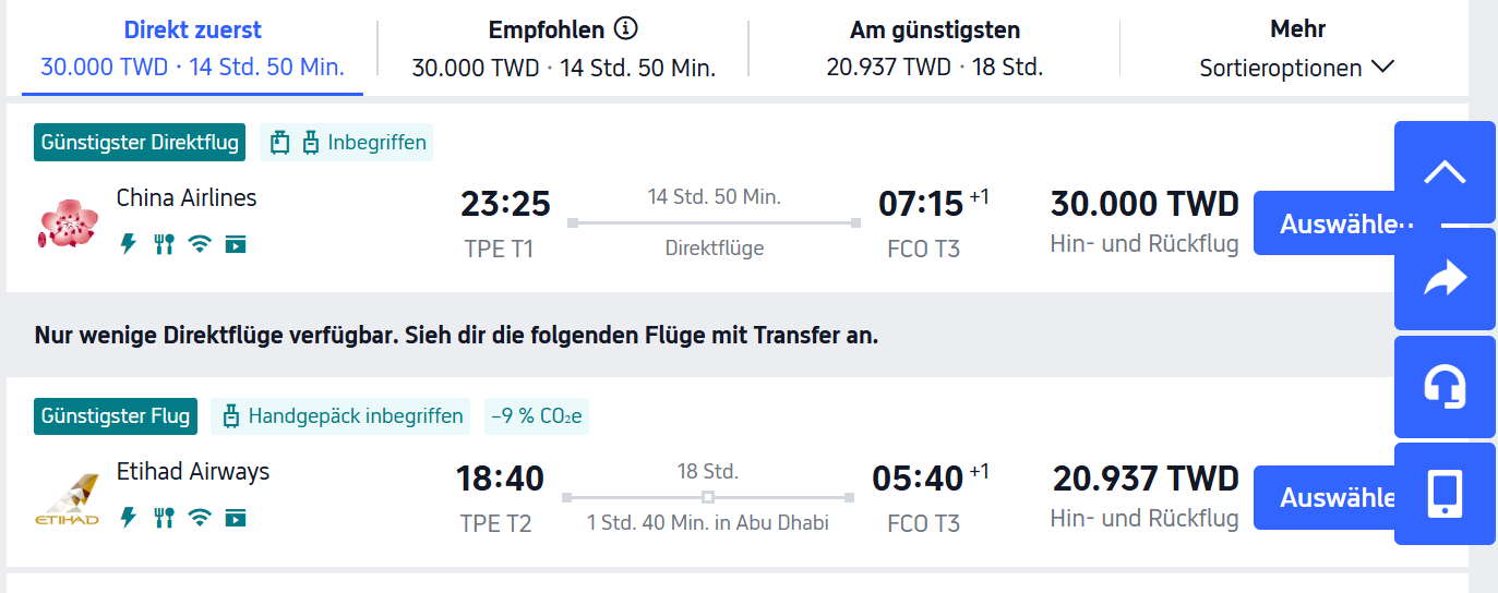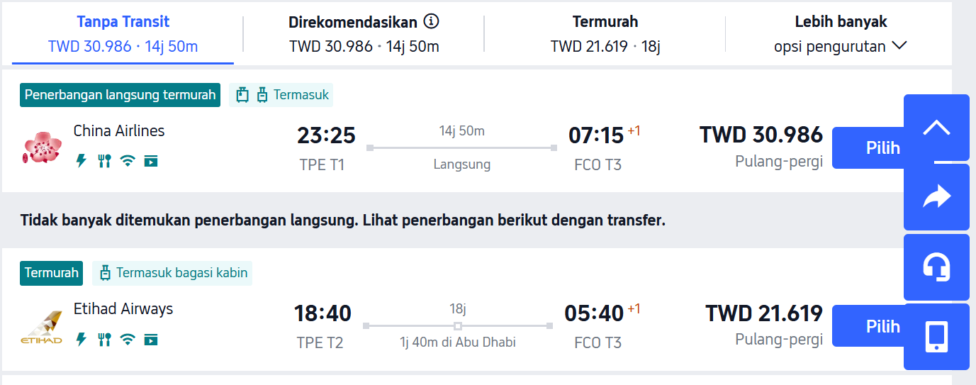 以下我就以一張【台北到羅馬】的機票來示範各語系的機票價格,這些畫面我就只是切換 Trip.com上方TWD左邊的【繁】字,只要點這裡,會出現一個畫面讓你選各國語系,你就大膽地點每一個試試看,覺得價格滿意就訂下去。