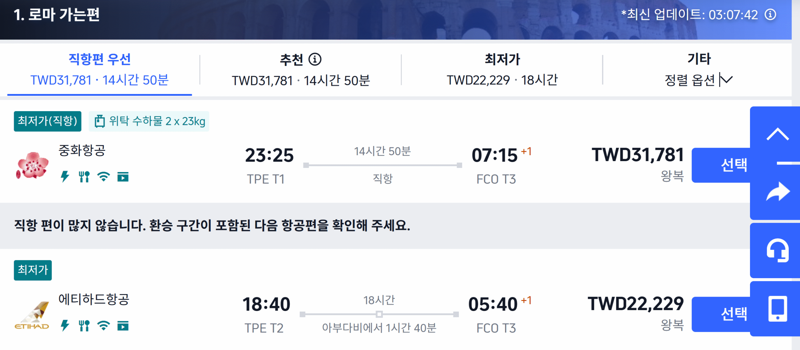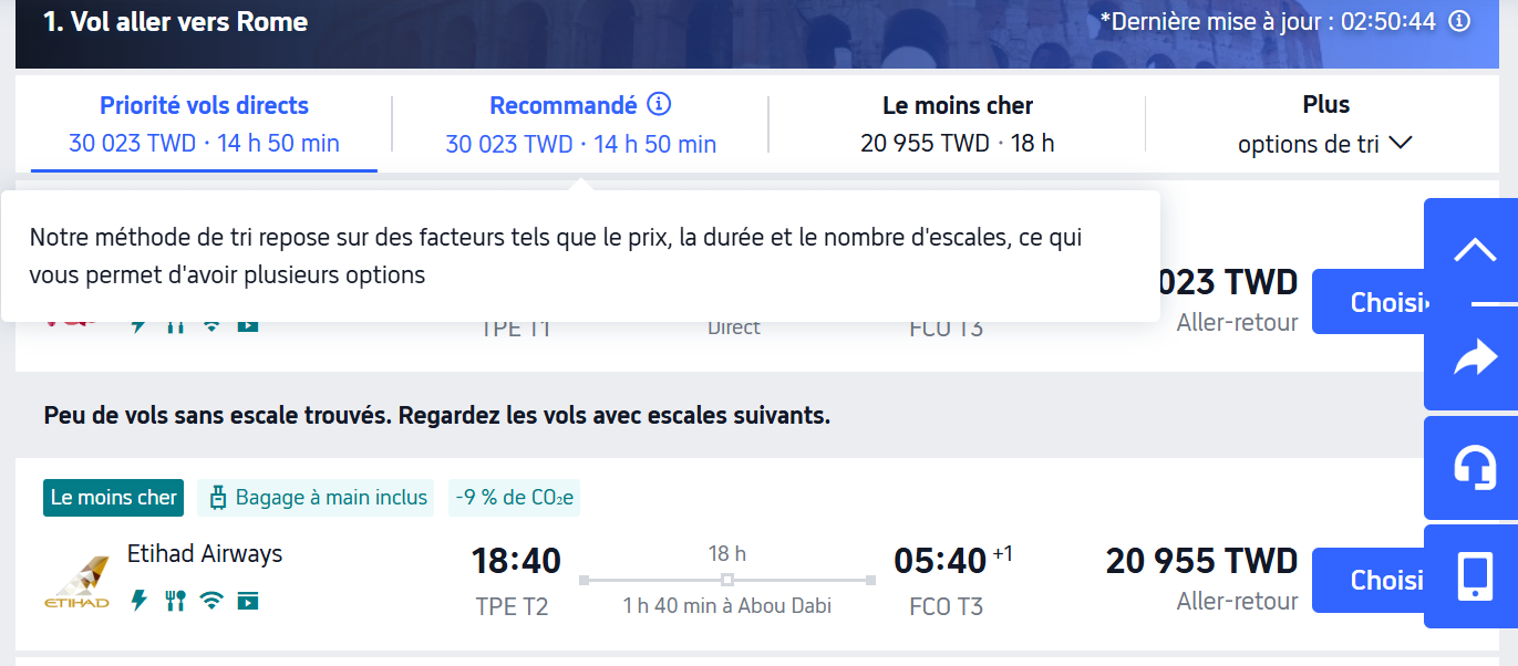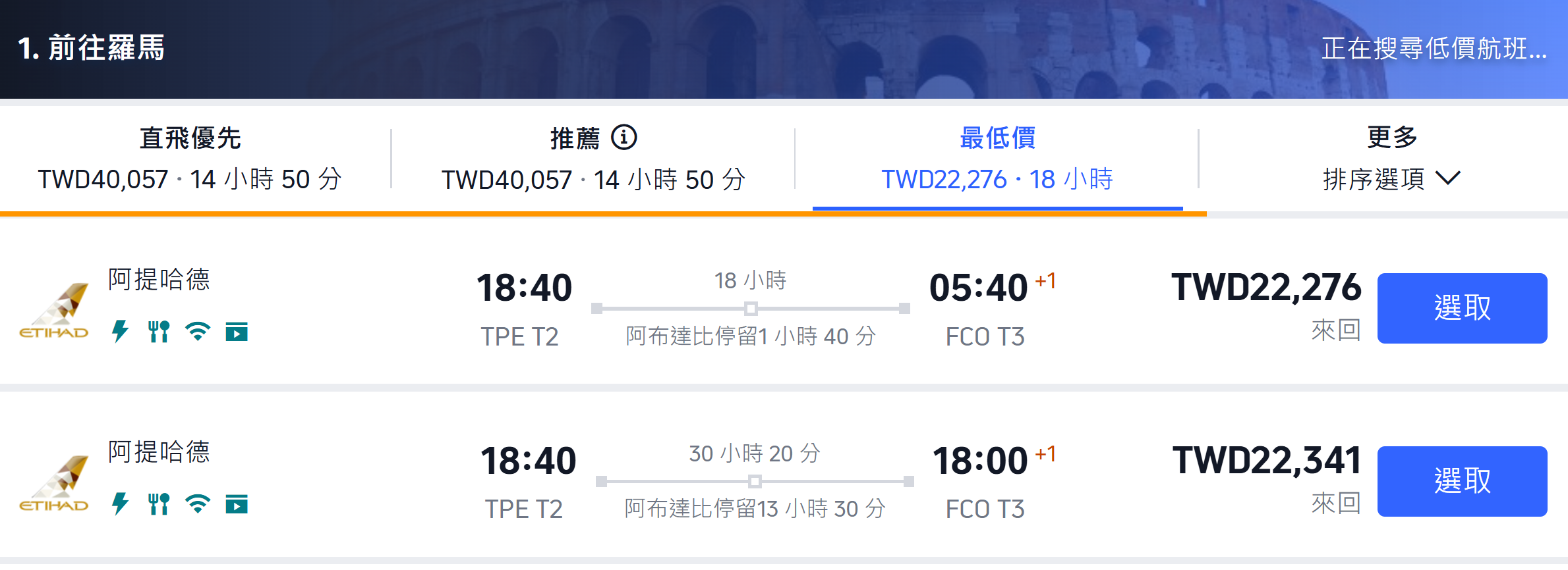 以下我就以一張【台北到羅馬】的機票來示範各語系的機票價格,這些畫面我就只是切換 Trip.com上方TWD左邊的【繁】字,只要點這裡,會出現一個畫面讓你選各國語系,你就大膽地點每一個試試看,覺得價格滿意就訂下去。
