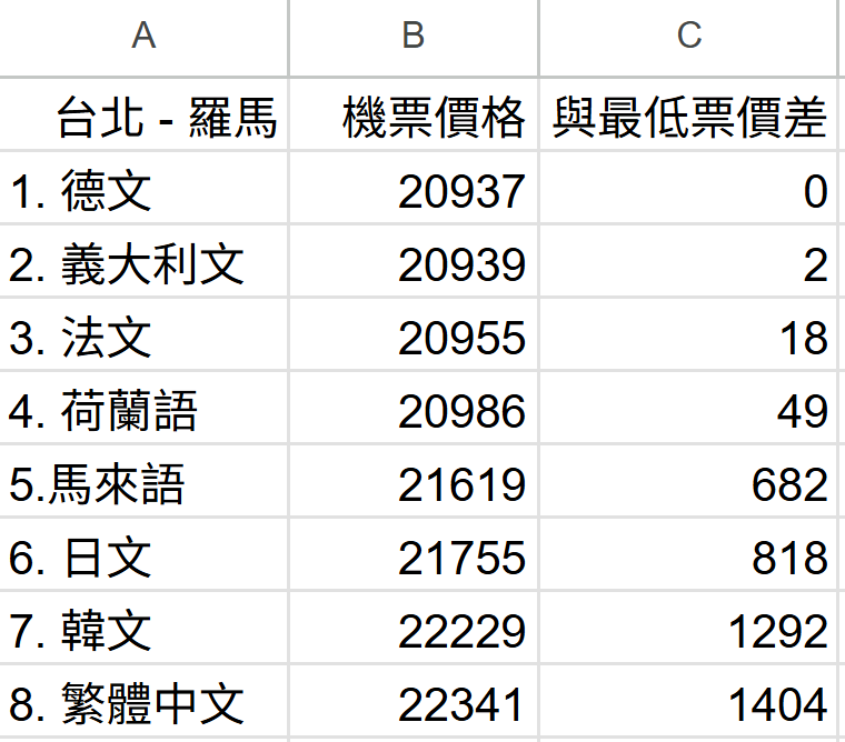 好了,最後我幫大家做了一個表格(畢竟我是表格達人),讓大家看看用不同語言顯示出來的票價跟最便宜的票價相差多少,結果用繁體中文的人明顯被歧視,是不是?我以前只覺得看得懂英文有優待,現在沒想到是看得懂中文會被貴到!