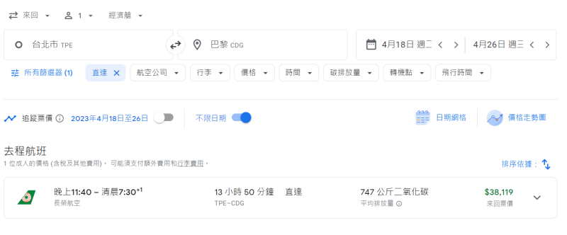 朋友是明年四月要去巴黎(我也有兩團四月的巴黎團),所以請我幫忙找便宜機票,如果設定在【長榮直飛】十天行程,這樣台北到巴黎來回機票大約是35000~42000不等(有可能更貴!) 隨便抓一個日期來示範: