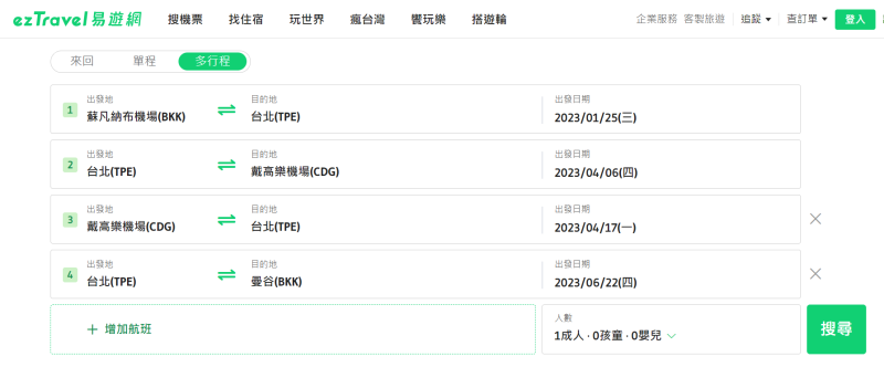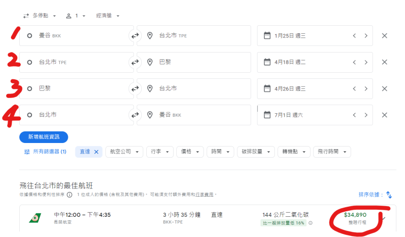接下來,我們換到正題搜尋。上面這張圖片有【四個】航段,也就是從上面那個台北巴黎來回機票延伸出來的,多了第一段BKK-TPE,還有第四段TPE-BKK。換句話說:除了第二和第三段台北巴黎來回機票之外,還多了台北曼谷來回機票,只是飛行的順序不一樣(這點說明待會再提醒)。