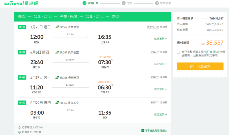 EZTRAVEL易遊網跟Google Flight一樣可以很方便變動日期去看票價,而且更讚的是:這裡可以直接下單買機票,五分鐘之內就可以出票完成。非常快速有效率! 以下面這張過年出發、端午回來的機票來說,價格是36K左右,行李還有23*2KG(現在長榮航空的標配),如果查好機票我們可以進入下一個階段。