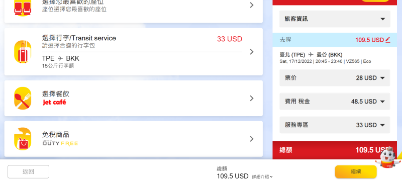 目前看起來台北曼谷單程機票中,越捷航空是最便宜的,不含行李(只有手提七公斤)是兩千出頭,包含15公斤行李則是三千多。