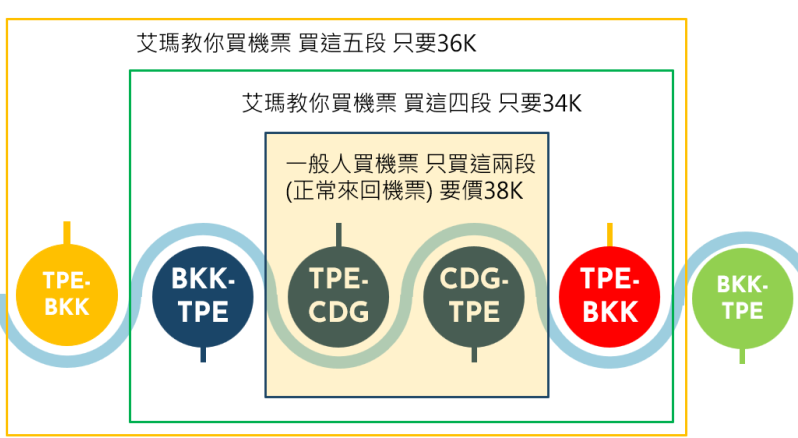 總結就是這樣,花最多錢只能買最少的台灣出發的中間那兩段台北巴黎來回機票,但是如果多加兩段,就會省四千,省這四千之後,一定得再多買一段黃色那一段,不然綠色框框中的那張機票整張都不能飛。所以究竟是要變成兩段行程還是三段,就靠大家自行決定了。